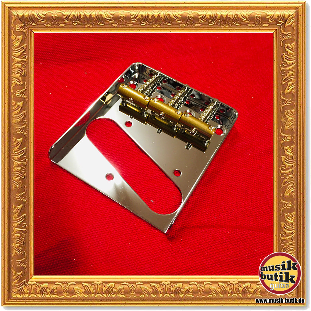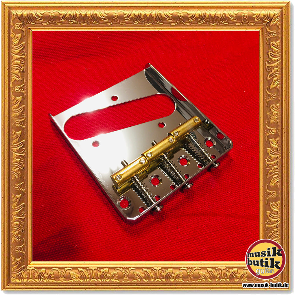 Göldo hat mit der KLuson HW4TC eine klassische "Ashtray" Style Bridge für Vintage Tele im Programm - wie das Original mit drei Messing-Böckchen und rundum hochgebogener Stahlbodenplatte.