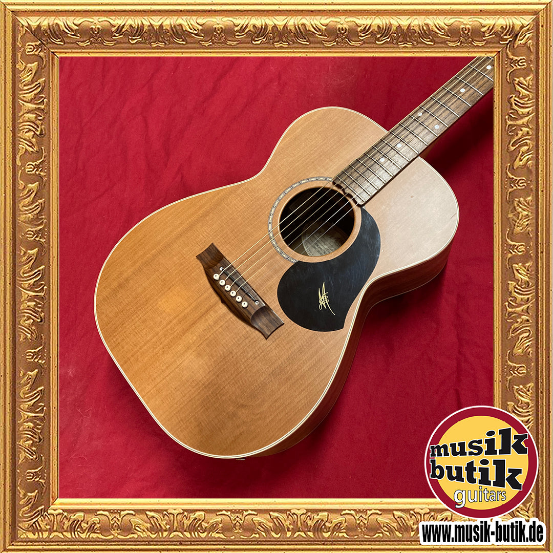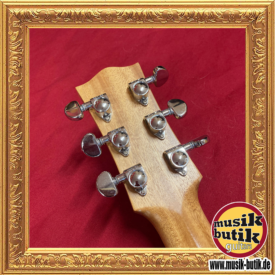 Die massive Decke sorgt für klare Projektion und Detailreichtum, während Boden und Zargen aus australischen Tonhölzern einen warmen, charaktervollen Grundton mit ausgewogenen Mitten und brillanten Höhen liefern. Der komfortable Hals ermöglicht angenehme Bespielbarkeit und präzise Artikulation über das gesamte Griffbrett.