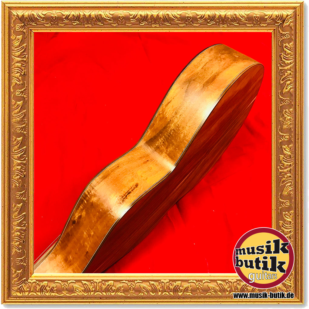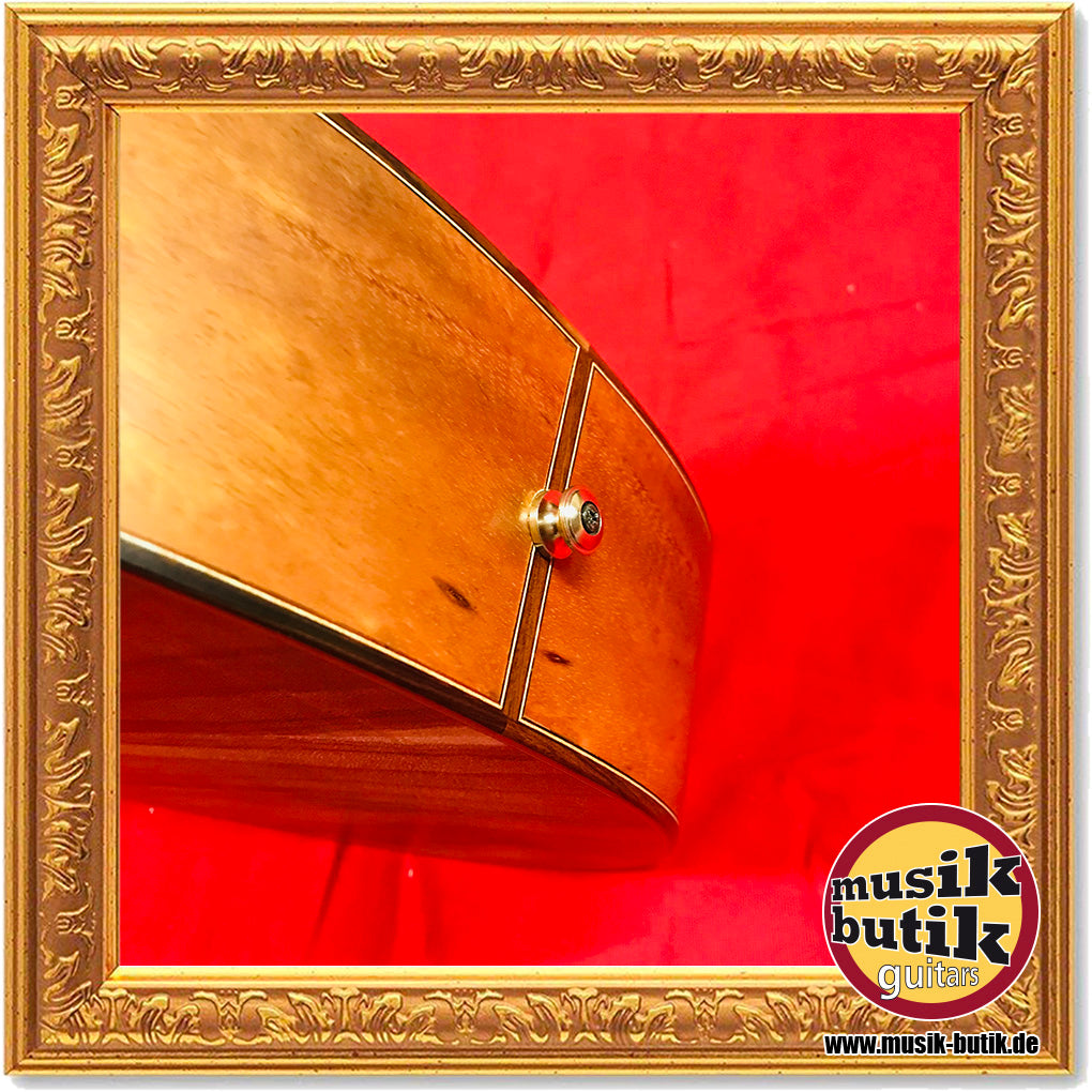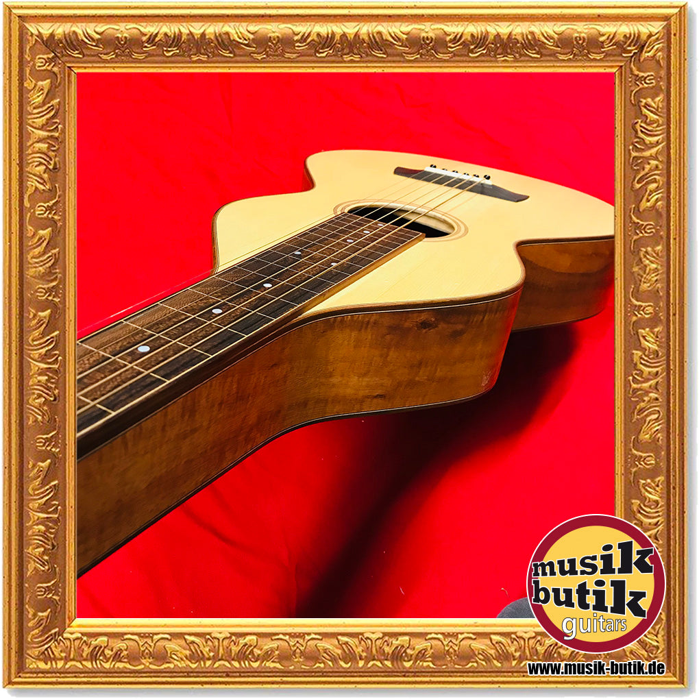 Die Gitarre spielt man wie eine Lap Steel Gitarre. Durch den hohen (hohlen) Hals ist diese Gitarre sehr resonant und deutlich lauter als eine gewöhnliche Akustik-Gitarre. Die Gitarre besitzt eine Alpenfichte-Decke. Boden und Zargen sind aus acacia Koa. Das für diese Gitarre verwendete Holz unterliegt keinen Tropenholzrichtlinien und wurde ausschließlich über zertifizierte Holzimporteure bezogen. Koa Holz unterlag zum Zeitpunkt der Herstellung und des Verkaufs keinen Cites-Bestimmungen (schreibt der Hersteller). Die Gitarre wird mit einem Koffer versandt oder am besten abgeholt. Durch spielen des Instruments befinden sich an der Stelle wo der Gürtel reibt ein paar kleine Kratzer. Ansonsten ist die Gitarre in einwandfreiem Zustand und freut sich auf einen Hawaiimusik-Liebhaber.