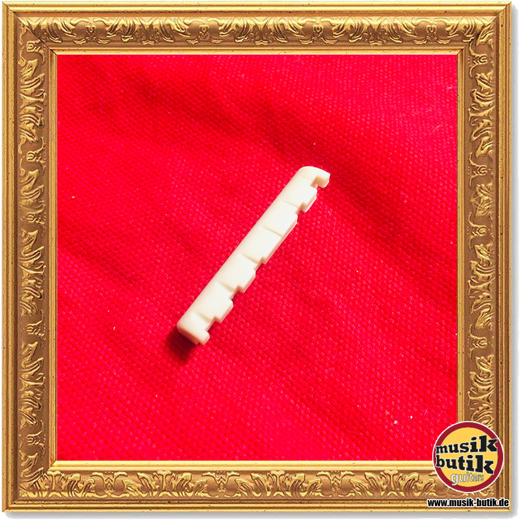 Anders als bei normalen Gitarrensätteln liegen die Auflagepunkte der einzelnen Saiten bei den Earvana "Shelf Nut" Sätteln nicht in einer gerade Linie, sondern leicht versetzt. Durch diese genau berechnete Kompensation der Saitenspannung wird eine bessere Intonation in den unteren Lagen erreicht. Der Sattel wird einfach in den vorhandenen Sattelschlitz eingesetzt.