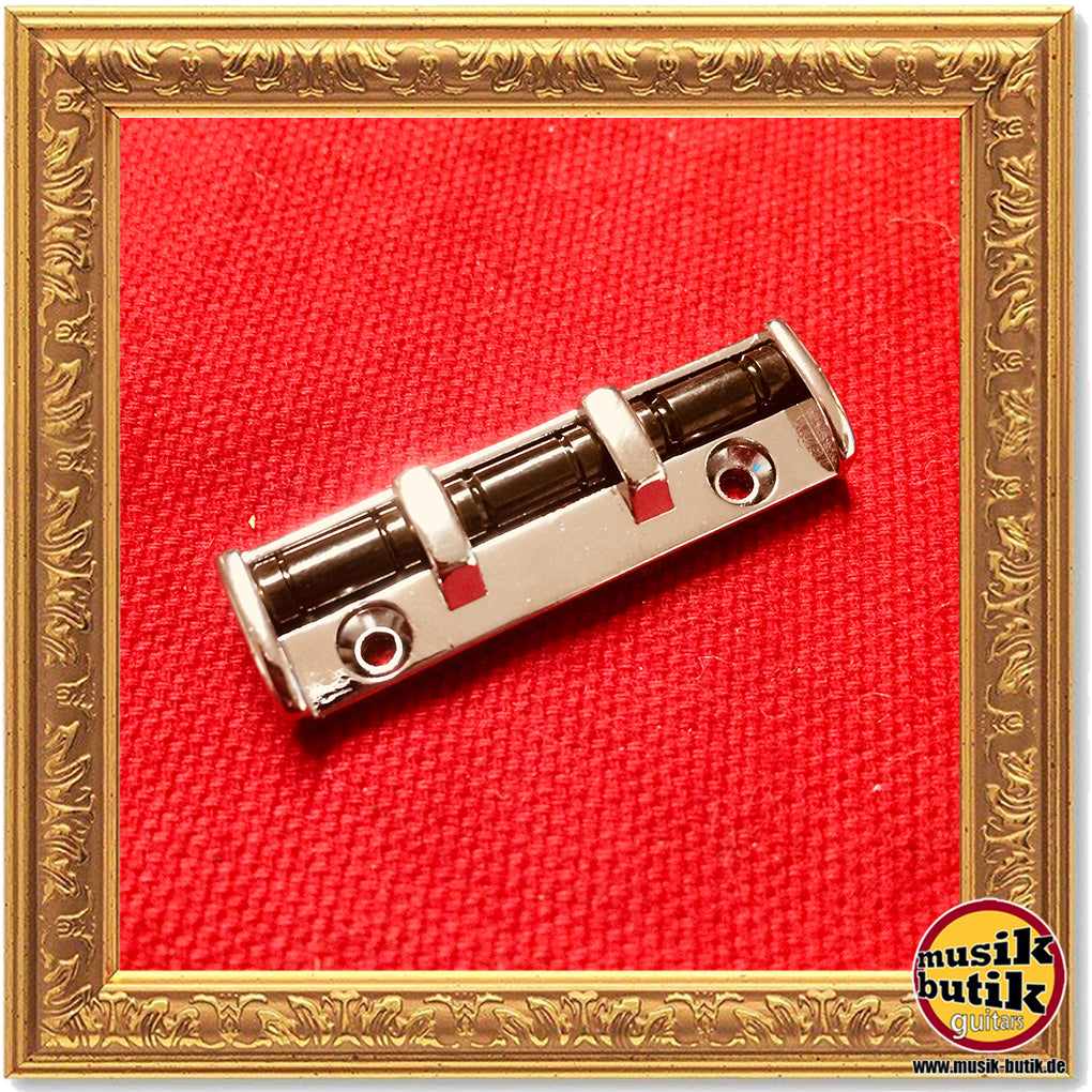 Drei Rollen, drehbar gelagert auf einer stählernen Achse, sorgen für reibungsfreies Tremolieren. Nichts klemmt oder hakt. 42,8x12mm, Höhe in der Mitte ca. 6mm, Stringspacing 35mm. Die Rollen haben 3,5mm Abstand zur Vorderkante, so dass das Griffbrett entsprechend gekürzt werden muss.